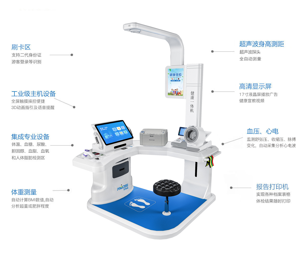 标配功能:身高、体重、BMI、体温、血压、脉率、人体脂肪、血氧、血糖、尿酸、胆固醇、血脂四项、腰围、臀围、心电、视力、色盲、